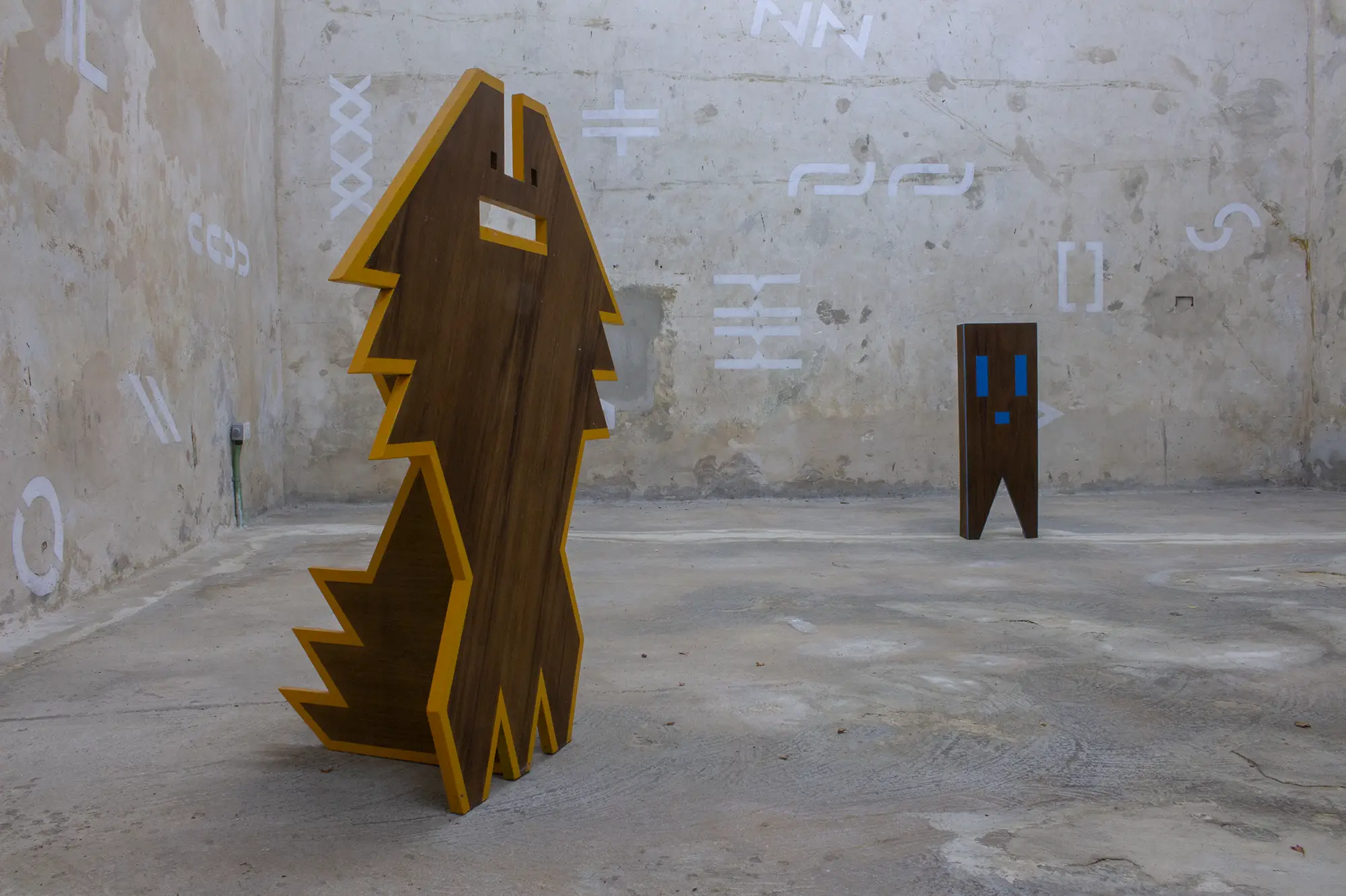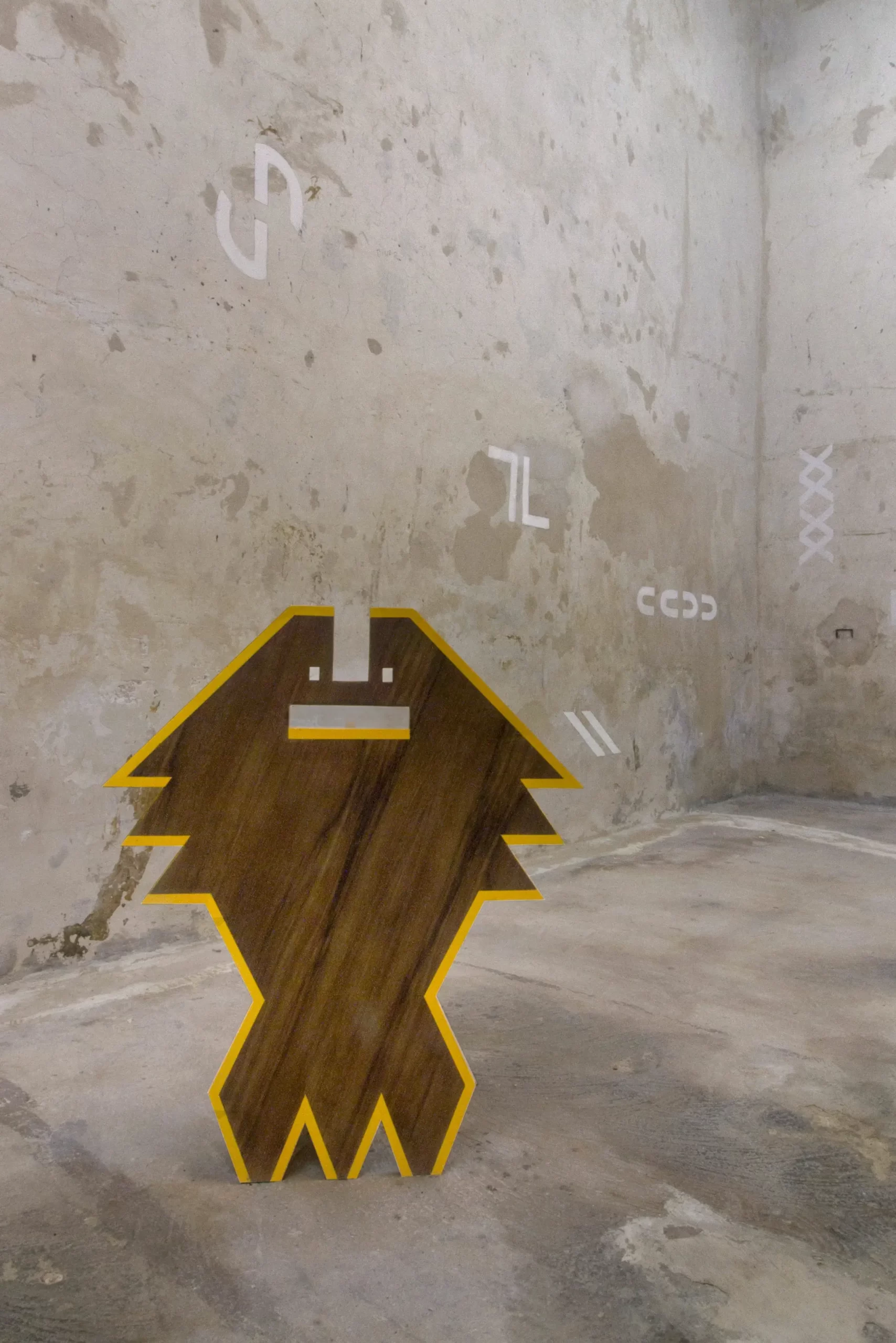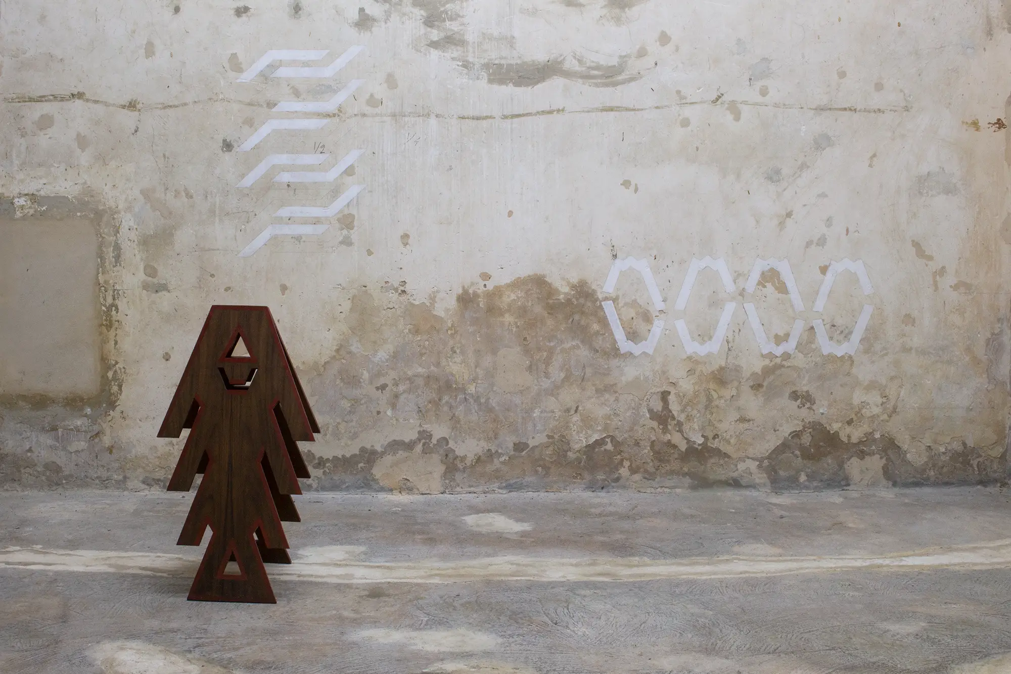 Podemos apreciar esto en la instalación de las piezas. Verás dibujos concebidos como esculturas en madera, cuya presencia ha sido calibrada hasta un sentido inicial y primevo, siendo formas que crepitan a veces como mesoamericanas, a veces como Primeras Naciones norteamericanas, y a veces como personalidades en madera de tzalam y cedro que te obligan simplemente a reconocerlas como existentes. Sin cognición, pero con personalidad. Tales son las funciones de estos arquetipos también en su propagación mural. Verás el espacio expositivo tejido por unidades genéticas monocromas en donde Rivero modula el entorno desde geometrías gestuales; siempre musculares, siempre frágiles.