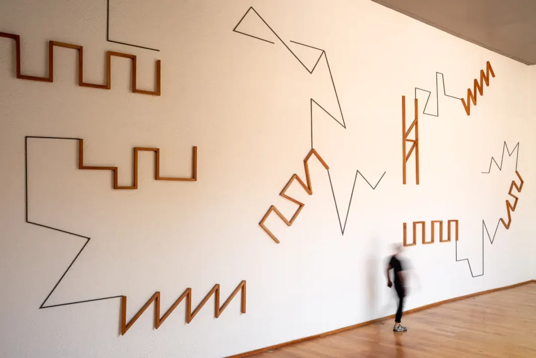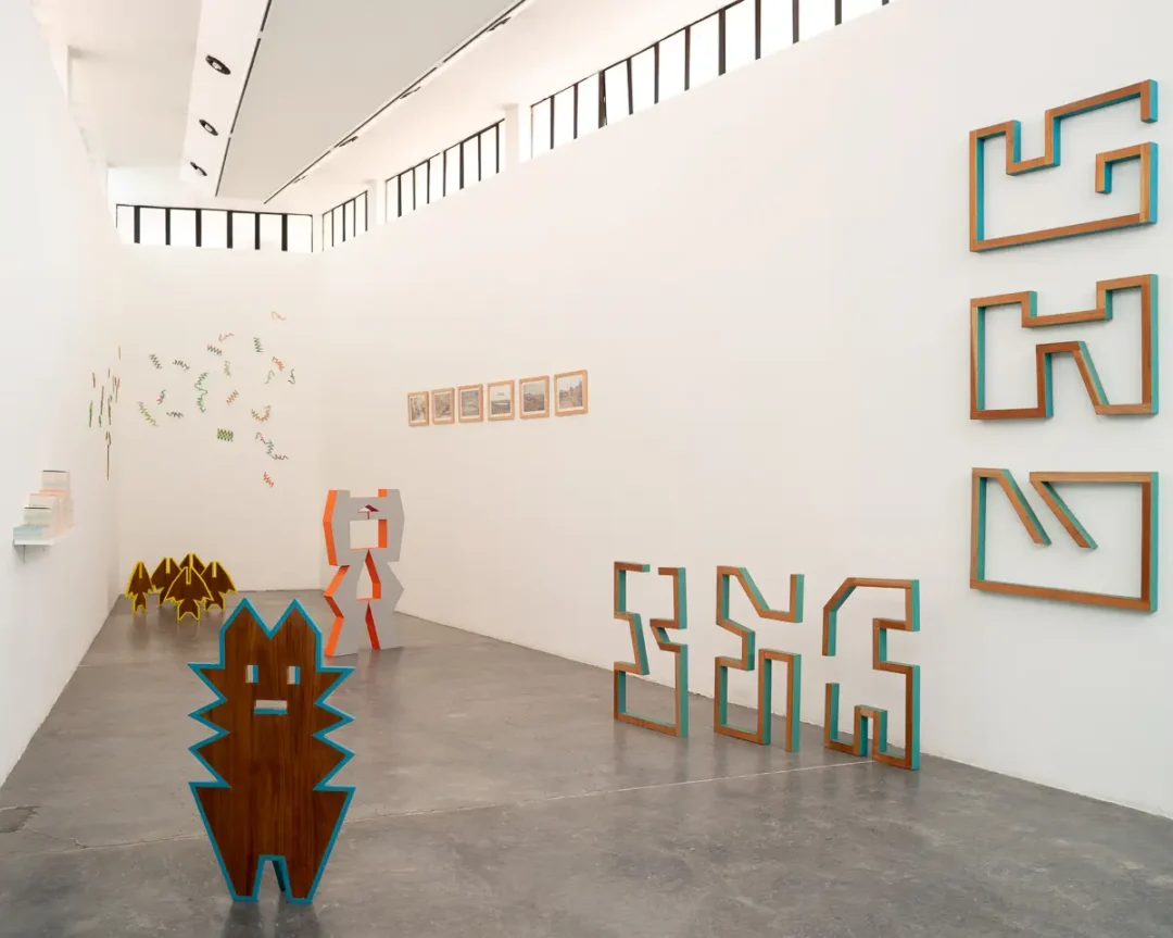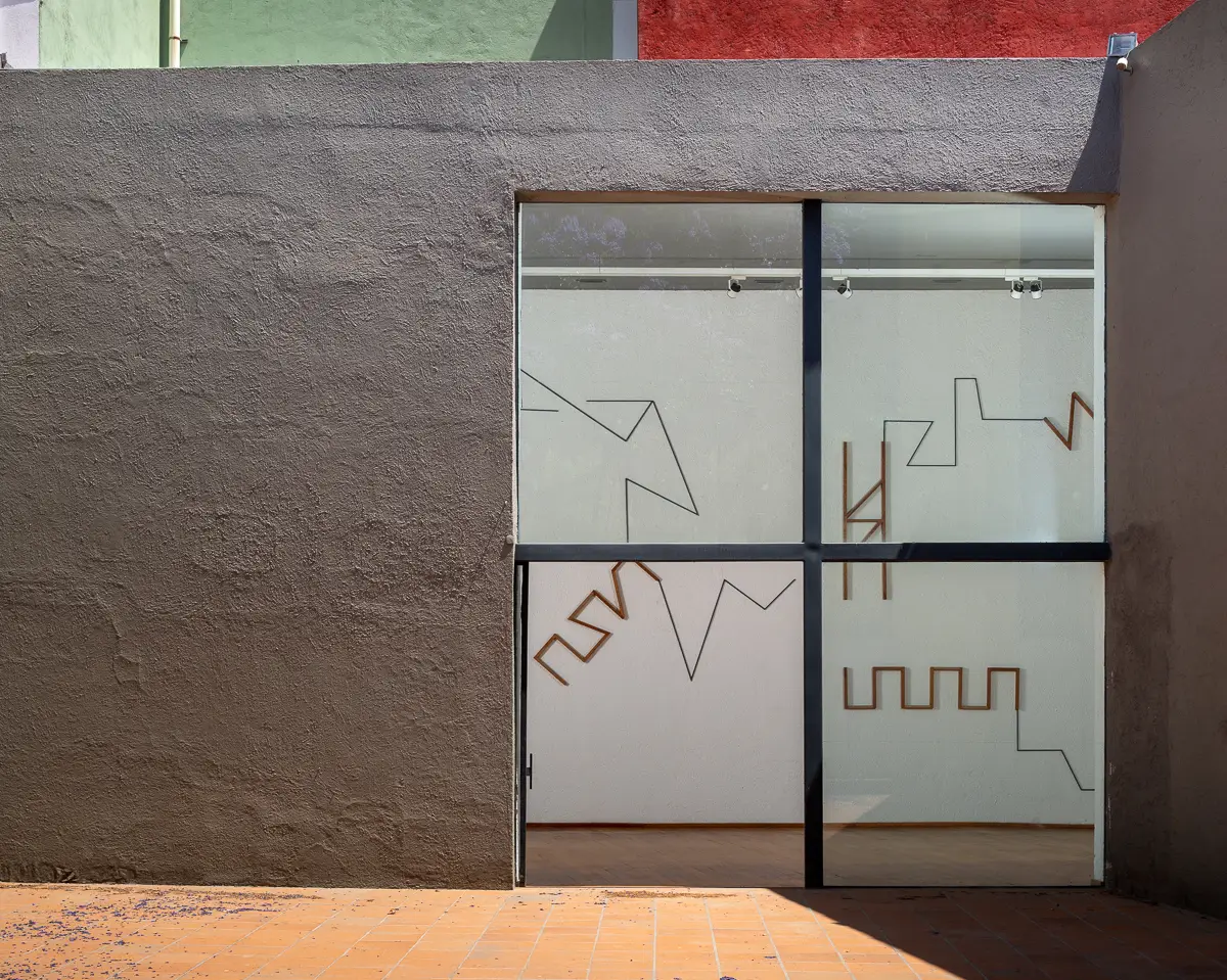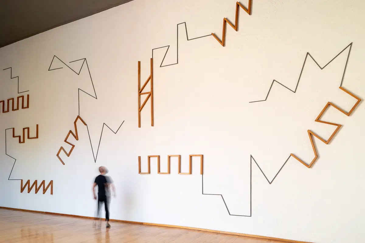 En la planta baja del museo la pieza central está conformada por una serie de estructuras que se adosan al muro norte del edificio, que es el más grande y de presencia constante en el recorrido del lugar. Elementos geométricos de metal y madera se acomodan a la manera de un dibujo a escala. Este “mural abstracto” dialoga con el poema plástico de Mathias Goeritz que se encuentra en la torre amarilla del patio, y al mismo tiempo despliega una suerte de abecedario cifrado que busca colapsar el lenguaje formal y escrito a favor de una cercanía que haga asomar la posibilidad de un terreno común o de “zonas complejas de contacto”. Como diría la bióloga y pensadora Donna Haraway desde su teoría sobre un pensamiento situado, esta es la única alternativa para ir contra de las estructuras de poder, y desde estos nuevos espacios afirmar verdades fuertes. Su teoría tiene mucho que ver con la posibilidad de relacionamiento dentro de estas zonas de contacto; y es desde ahí que este nuevo abecedario o estos signos se piensan. También desde un vínculo con ideas que indagan en cosmologías ancestrales, como es el caso del antropólogo y pensador Eduardo Viveiros de Castro, que con sus apuntes sobre la cosmología amerindia ha contribuido de forma clara a escrituras que desglosan las dicotomías tradicionales de la modernidad con la intención de desarrollar nuevas sensibilidades y comprensiones de mundos posibles.