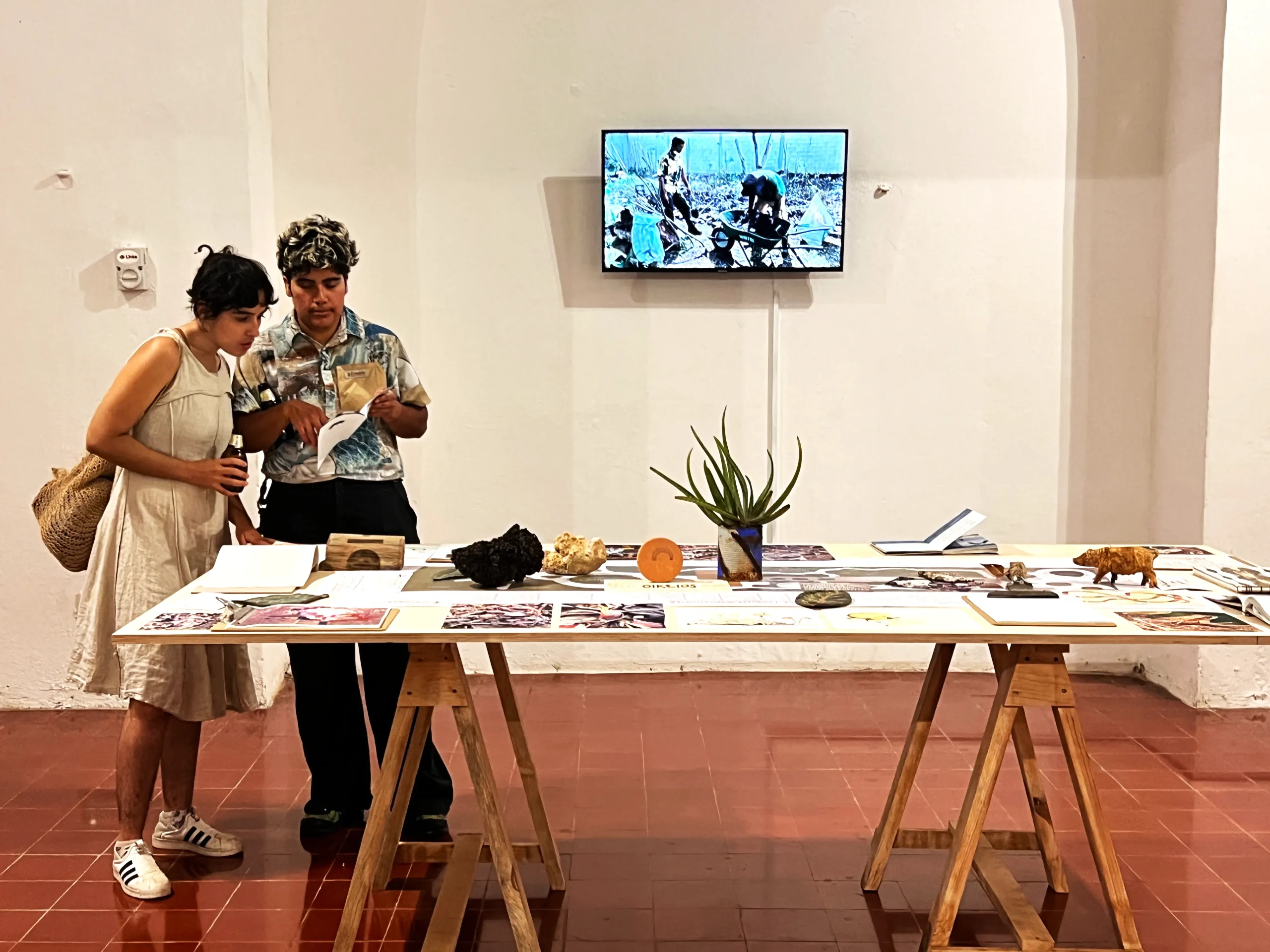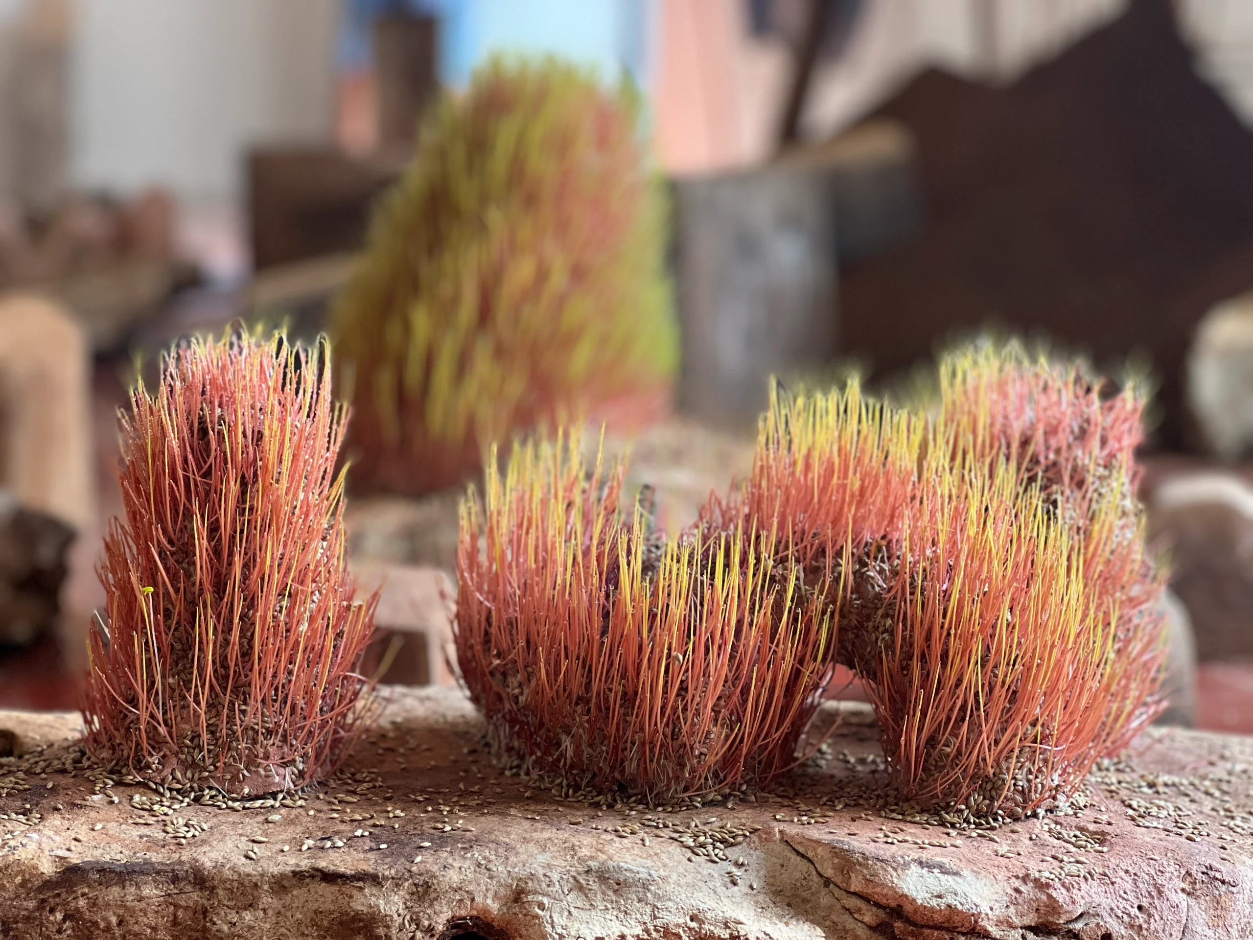 Con la arcilla que se preparó en Sitpach se modelaron aquí mismo unas esculturas vivas, que nos permiten ver el acontecimiento de cómo va germinando una semilla. Vanessa hizo pruebas para ver cómo reaccionarían el alpiste, la lenteja, el frijol, y la chía, al ser plantadas sobre formas irregulares de barro. También procuró regarlas, para conocer la humedad que necesitarían. Algunas se secaron, y es que había que ver las distintas etapas de la vida de estos brotes, incluida la muerte.