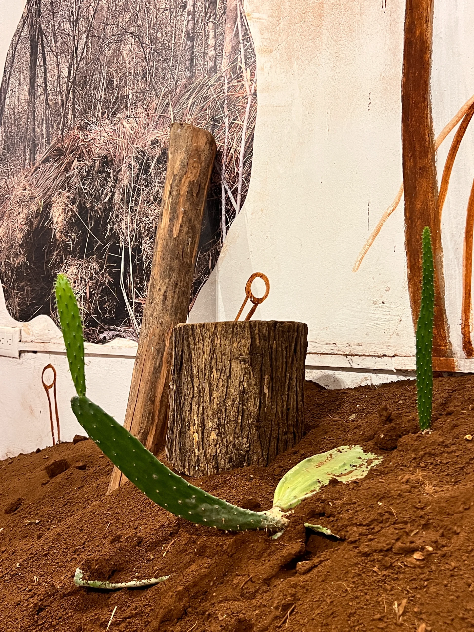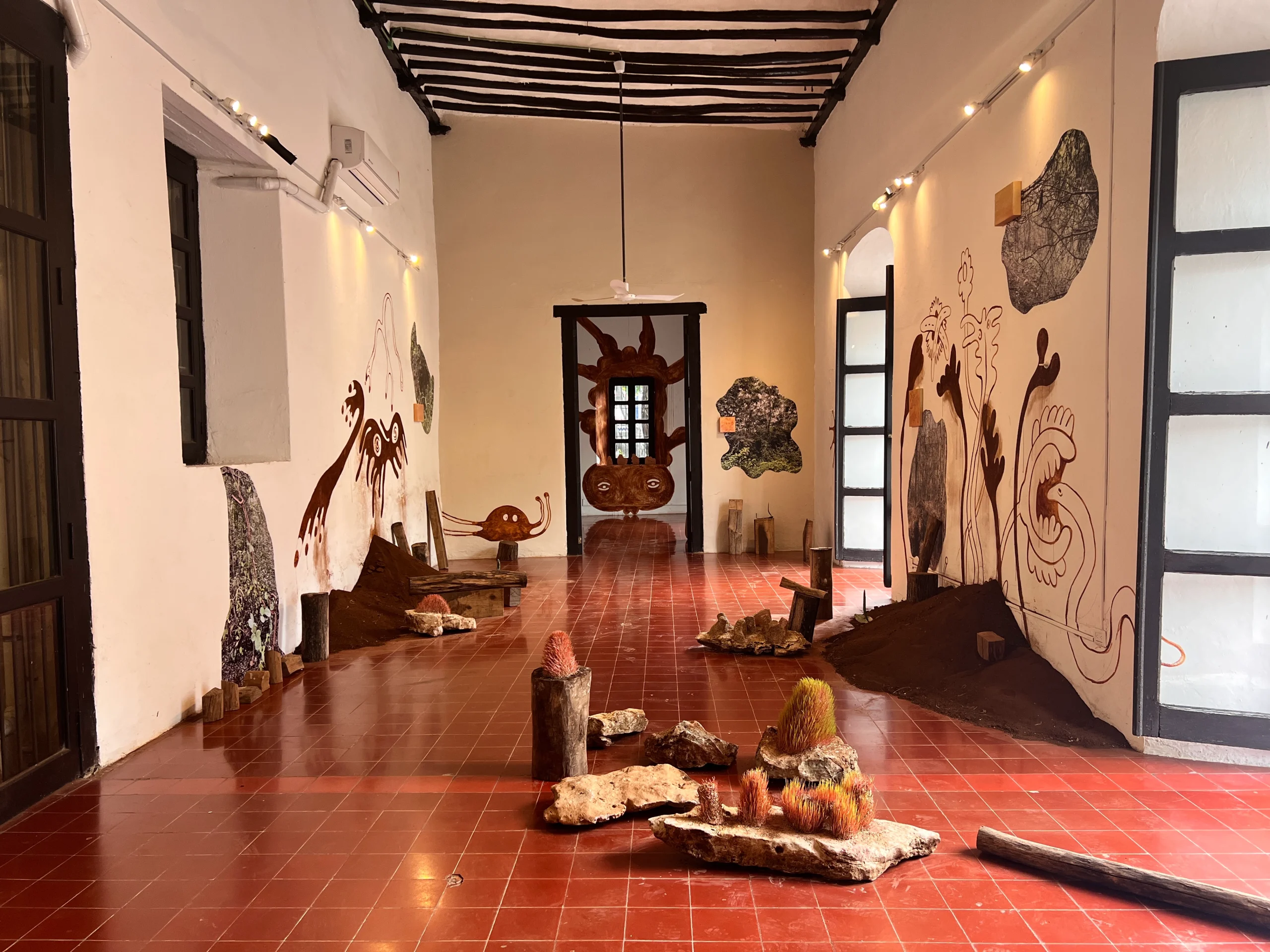 Esta instalación es un dibujo que conecta dos espacios físicos: Un jardín y un edificio histórico. Para construirla, partes del terrario – que se encuentra en las afueras de Mérida-  fueron trasladadas al centro de esta ciudad y están dispersas por la sala como portales.