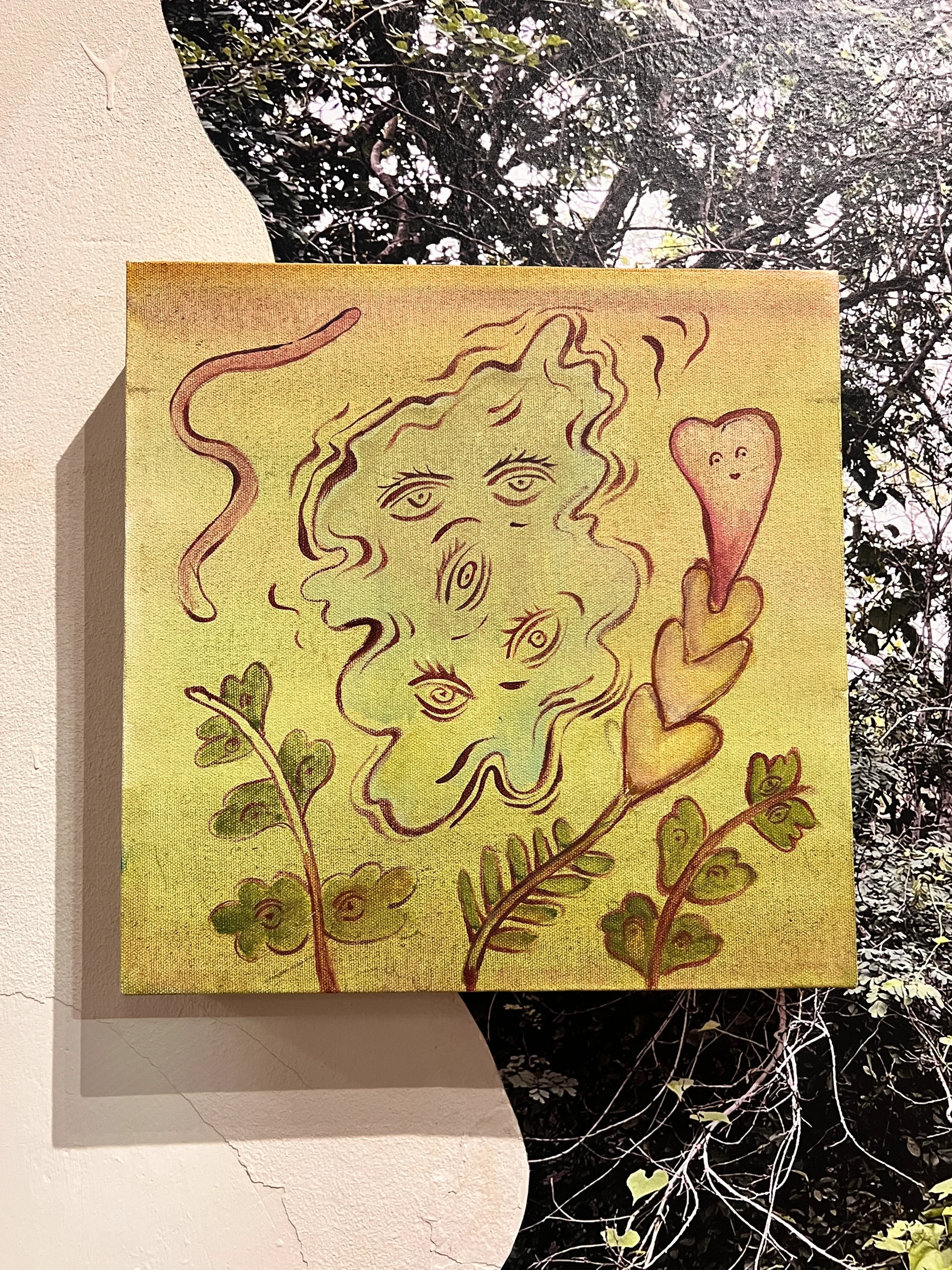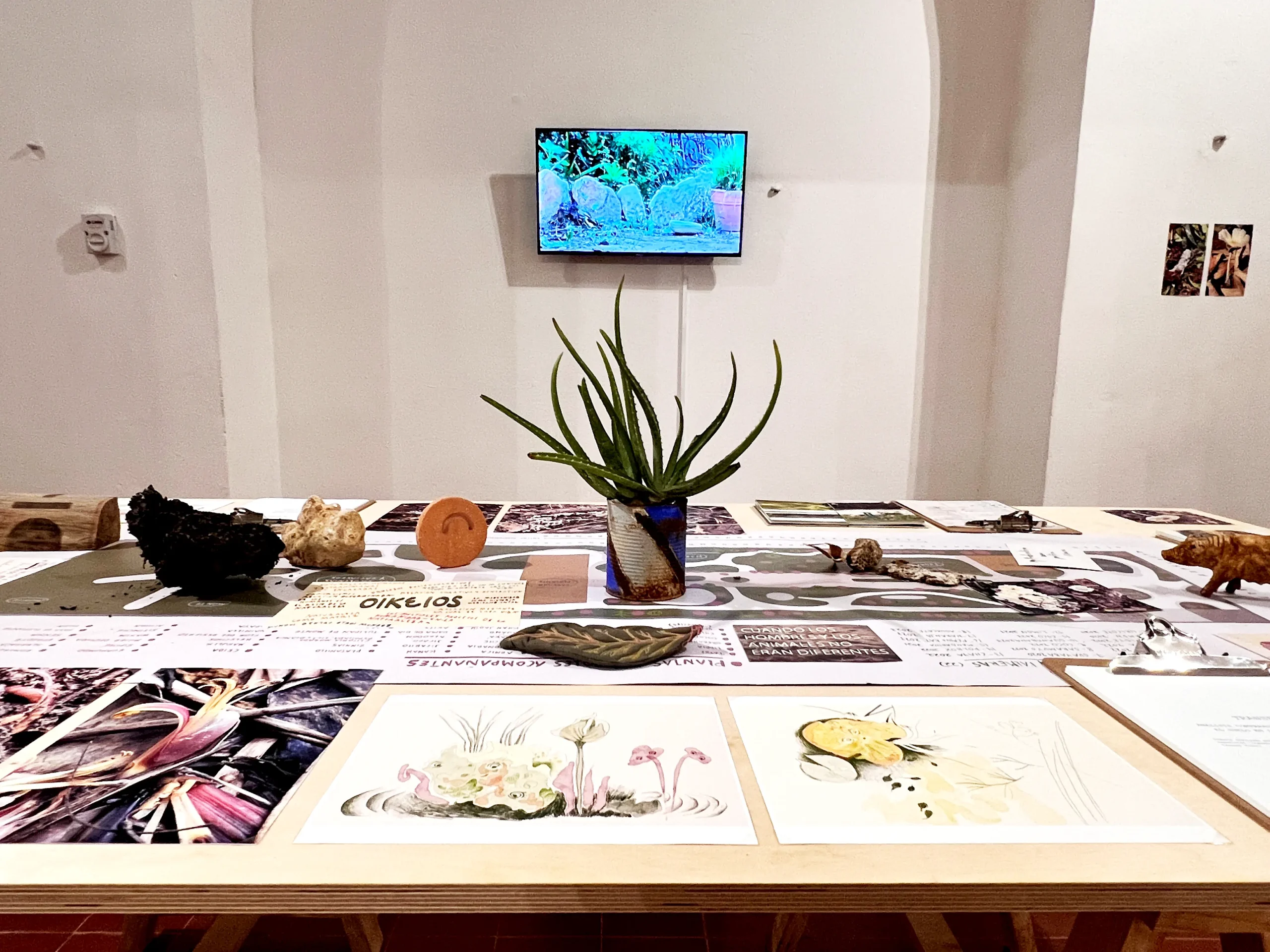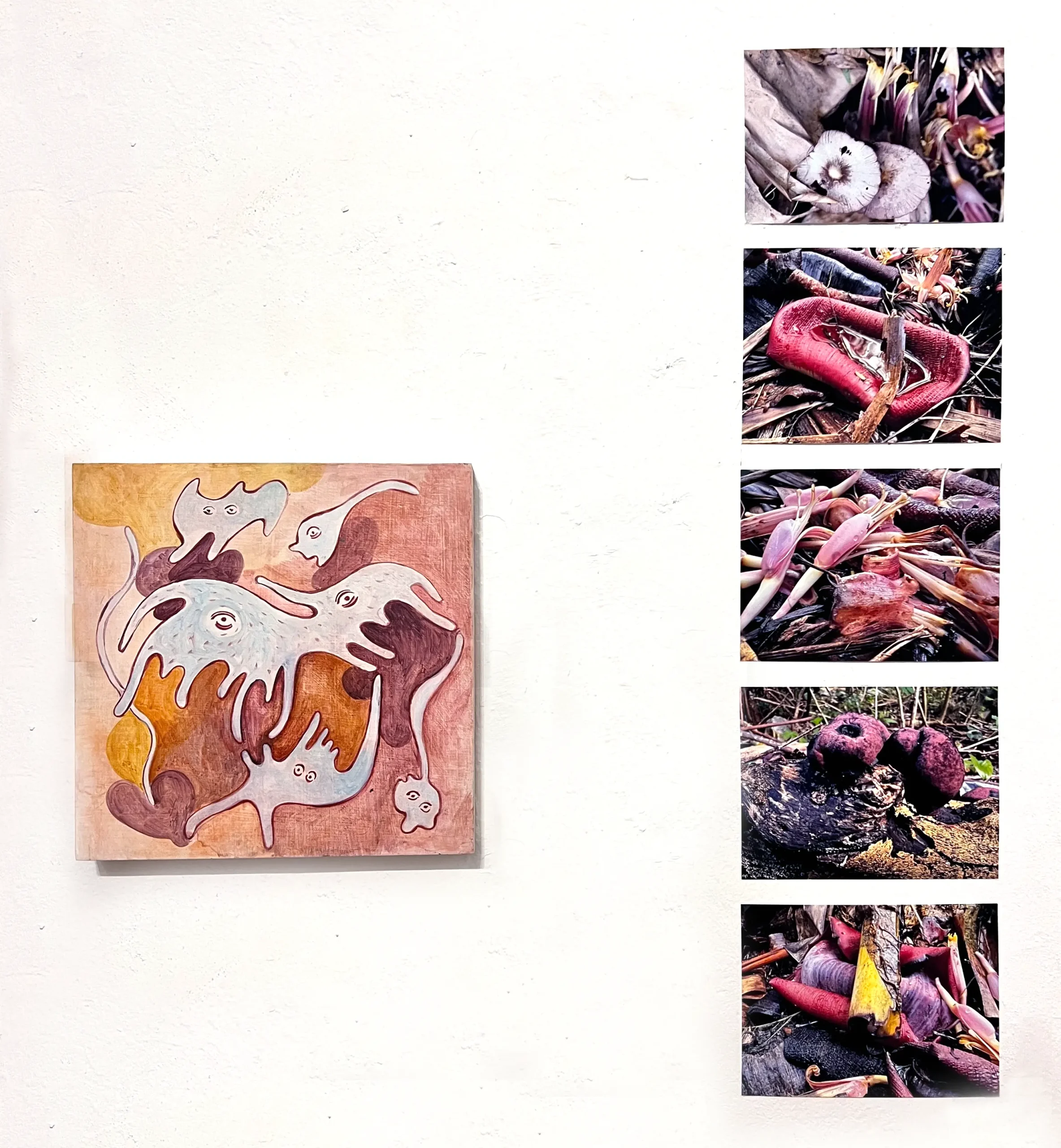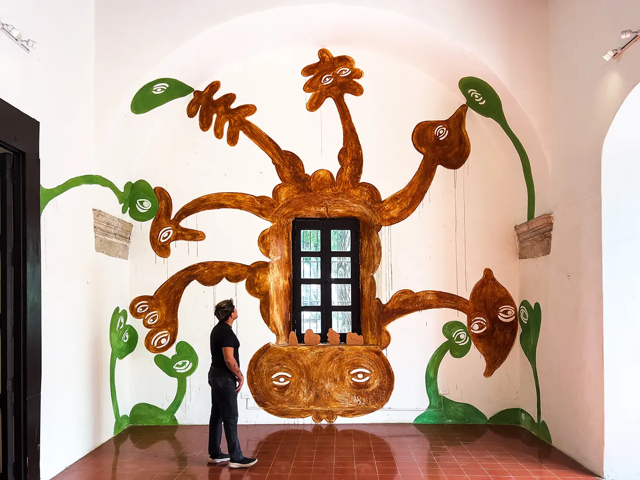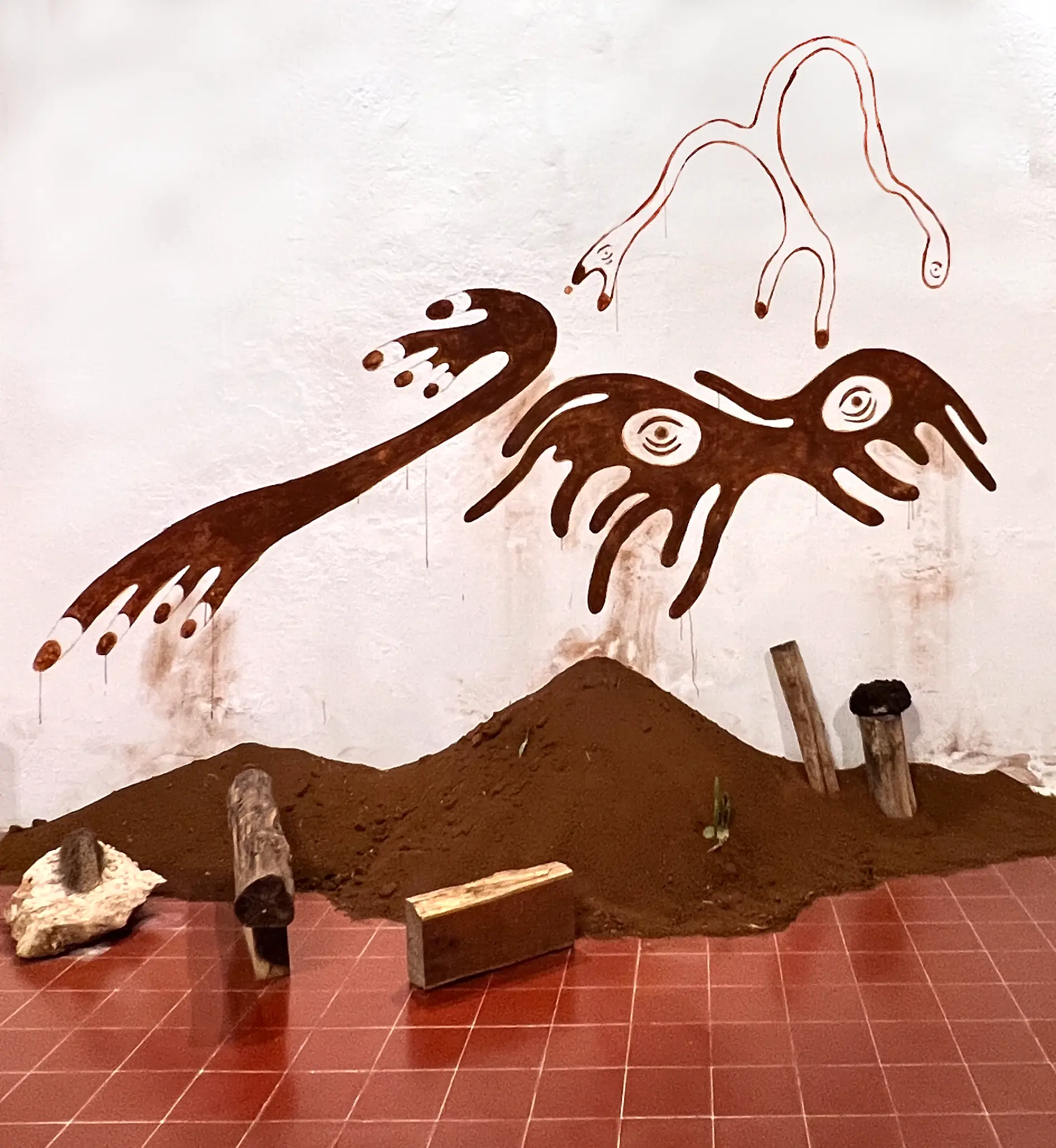 En los murales, el suelo se utilizó como pigmento. En ellos aparecen microbios y comunidades vegetales, que también encontramos en algunas partes de la instalación como esculturas. Cuando Vanessa les dibuja una mirada nos recuerda que tienen una conciencia y un sentir, aunque sean diferentes al nuestro.