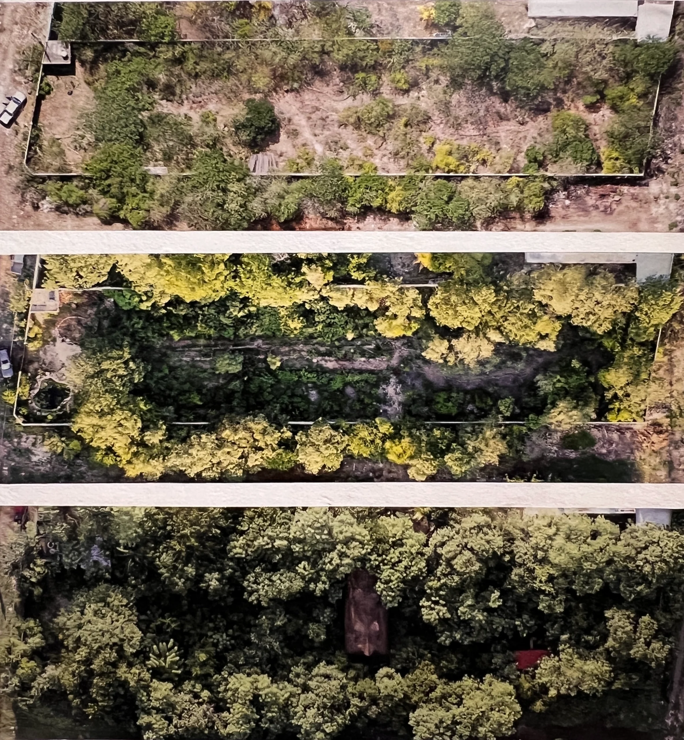 Para esta exposición otra forma de dibujo fue hecho en el terrario con la colaboración de Arnaud García. Al hacerlo, un largo flexómetro se coloca de extremo a extremo sobre el suelo, midiendo a lo ancho todo el terreno. Esta actividad llamada “transecto” es una manera de recopilar datos sobre cómo ha evolucionado el jardín.