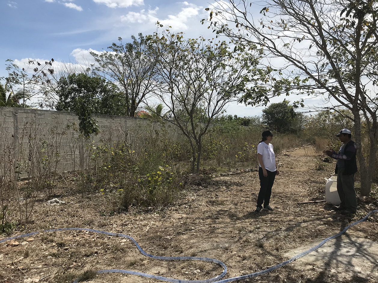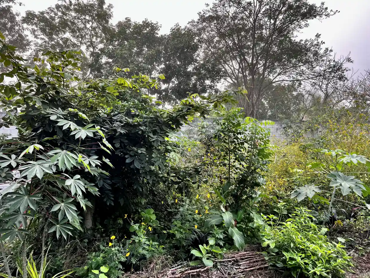 2023 -El sistema agroforestal ( la linea de enfrente y del fondo) 1 año después de haberlo empezado! El Ramón ( el arbolito en medio) lleva ya 3 años. Los arboles altos que están afuera en la calle se han beneficiado muchísimo con el riego también.