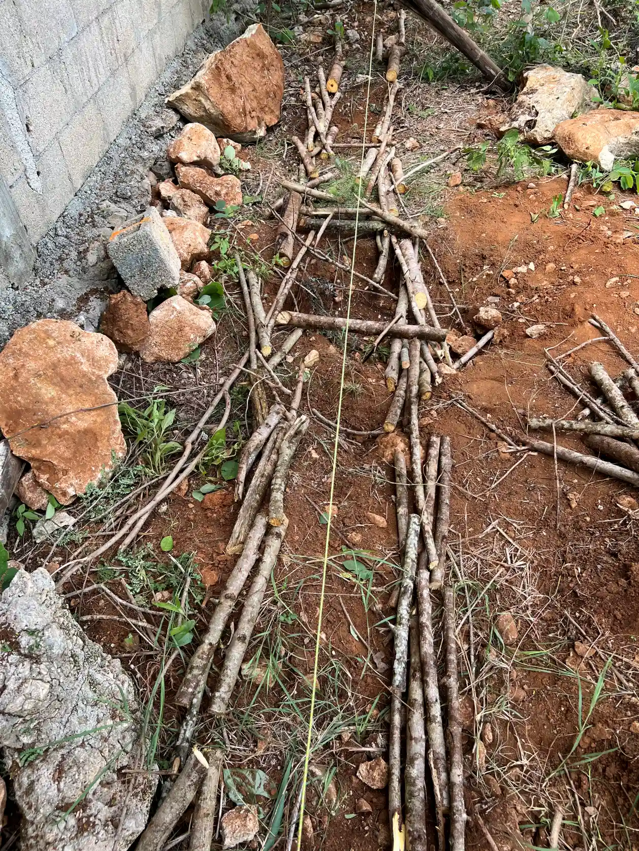 Lo primero que hicimos para implementar el sistema fue una poda general de algunos árboles y arbustos. Después hicimos un pequeño valle de los troncos y las hojas que salieron de la poda, para alimentar la tierra y procurar que los microorganismos se multipliquen. Una tierra llena de vida es una tierra fértil. En medio de esa línea de troncos y hojas sembramos las plantas.