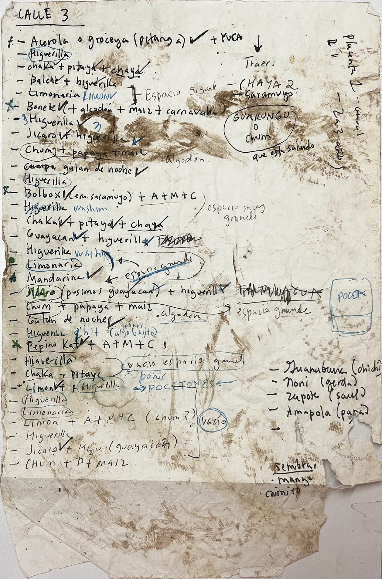 El sistema agroforestal que tenemos en el Terrario consta de 4 calles (lineas) de plantas. Cada calle mide aproximadamente 30 m de largo. En cada linea plantamos aproximadamente 40 plantas y sembramos muchas semillas. Ahora hay muchas otras plantas que han llegado solas al irse regenerando el suelo. Cada una de las plantas forman parte de una comunidad, con una función importante en el sistema. Un sistema vivo para regenerar la tierra y ampliar la biodiversidad.